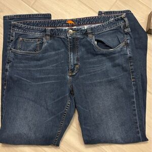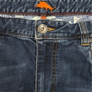 These relaxed pants from Tommy Bahama feature a classic dark blue denim fabric with a rich indigo hue. The slight texture of the denim adds to its quality, making it a comfortable choice for casual wear.