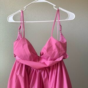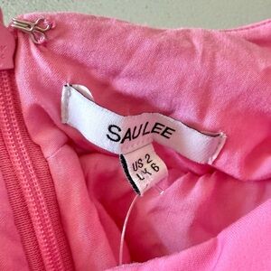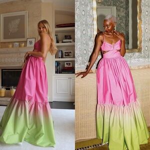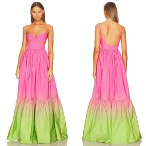 SAU LEE Nova Cutout Maxi Dress Gown in Pink Green Chartreuse Ombre. Size 2 US. In good preowned condition. Material: poly. Fully lined, concealed back zip, adjustable shoulder straps, cut-out at the waist, slanted side pockets, heavyweight poplin fabric with flounce hem.
