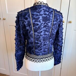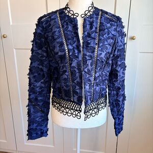 Chic navy lace blazer with intricate patterns. Stylish and versatile for any event.