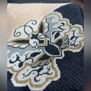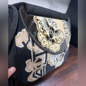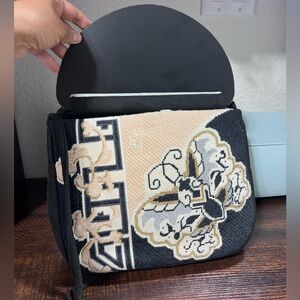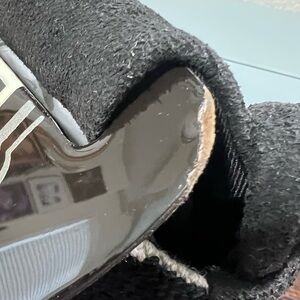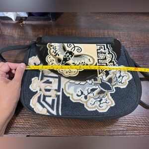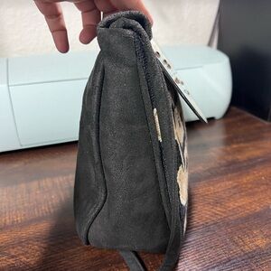 A scratch on front and the edge shows some wear on both sides of the flap. Flaws shown in pictures. Measurements in pictures