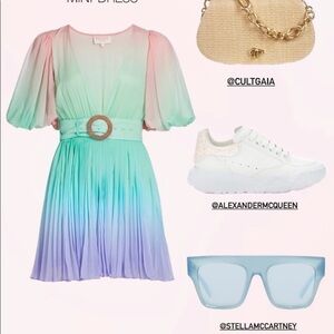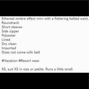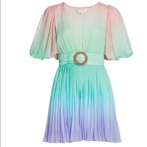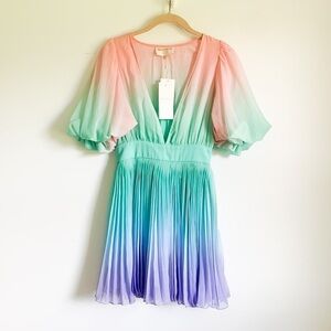 New with tags! Rococo Sand Emi Ombré Pleated Mini Dress in Sand. Size XS. Elastic at short sleeve cuffs. Fully lined. Missing belt. Absolutely gorgeous! Influencer favorite!