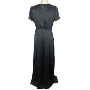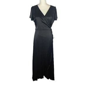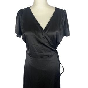 Elegant black wrap dress. Short sleeves. Flowy silhouette. Perfect for any occasion.