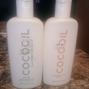 Coco Oil body and tanning oil set. Includes SPF 15 body oil and tanning oil. Perfect for sun protection and tanning. one bottle of organic coconut oil body and beach oil 200 ml 6.7 fluid oz SPF 15. You're also getting a bottle of tanning oil SPF6 6.7 ml brand new