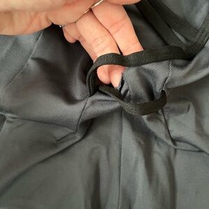 Gaynor Minden microfiber cami/tank leotard in charcoal gray with black double straps, a low v-back and cross detail on the back. Has a tiny tear in the back that’s covered by the straps so it isn’t visible.