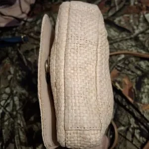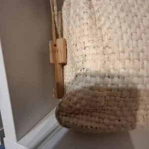 Enhance your home decor with the Fossil Woven bag. This cream-colored basket adds a touch of elegance and natural texture to any room. Perfect for organizing or as a decorative piece.