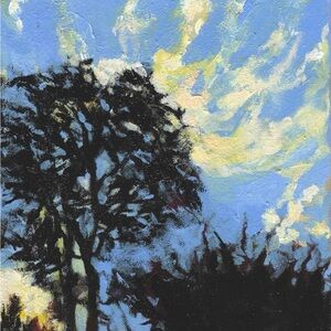 Peaceful Sky was originally created as an acrylic painting for a community fundraiser for mental health resources in Tulsa. This painting was inspired by looking straight up from the ground in the evening, and capturing the way the trees and clouds look.