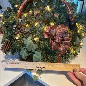 Brighten your home with this festive holiday basket featuring woodlands figurines, warm lights, and a decorative bow. Perfect for adding a touch of holiday spirit to any room.