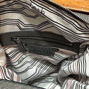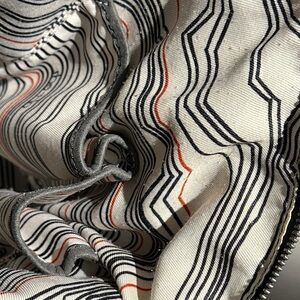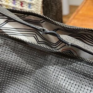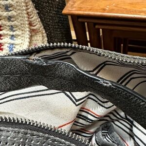 Features excellent condition perforated gray leather on exterior. Zipper accented hardware and metal studs on the gray leather give a “moto” vibe. Has a detachable, adjustable shoulder strap (to wear as crossbody) and an attached, non-adjustable shorter shoulder strap.