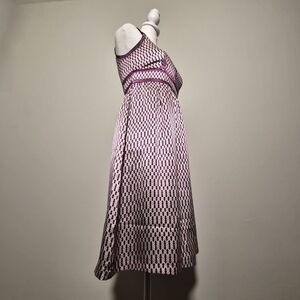 This Proenza Schouler for Target 100% silk dress is a stunning and elegant choice for any occasion. The dress features a circular geometric pattern in a delicate white and mulberry purple color combination, with a sleeveless design and round neckline.
