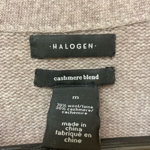 Halogen super soft open cardigan with two front pockets. Ribbing on hem, sleeves and pockets. 70 percent wool, 30 percent cashmere. Super soft. Would benefit from a sweater shaving. Pit to pit 22, length 41. This lovely cardigan has no rips , tears, snags or stains and is in very good pre-loved condition. Size Medium.