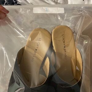 NWOT Lucky Brand wedge heel sandals with black and tan on the bottom. There's a black strap over the top. These look practically brand new! Size 9.5