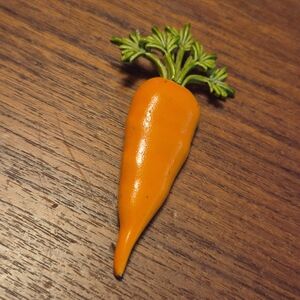 Charming orange carrot brooch with green leaves. Perfect for adding a playful touch to any outfit! This is orange painted metal