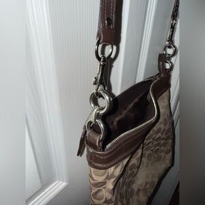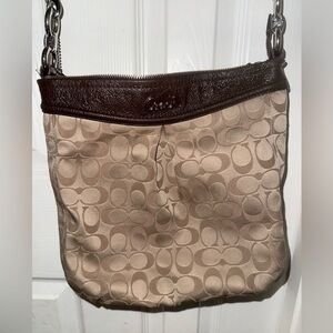 This is a Coach Ashley Signature Hippie convertible crossbody bag in a beige/khaki signature canvas with brown patent leather trim.