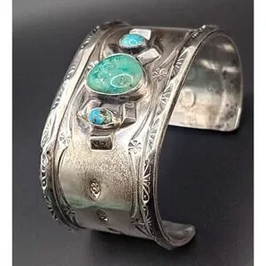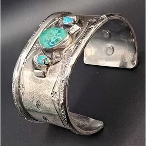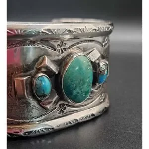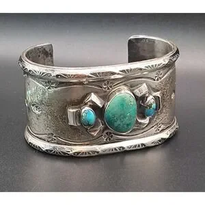 Vintage Navajo 3 Stone Turquoise SS Wide Cuff Bracelet~