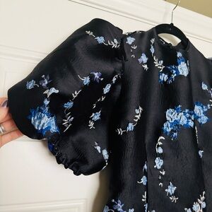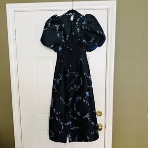 Brand new, never worn! Gorgeous black dress with silver and blue flowers and a chic open back. Size 36 which is equivalent to size Small/US4!
