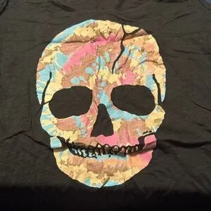This stylish black tank top features a colorful skull graphic, perfect for adding a fun touch to any outfit.