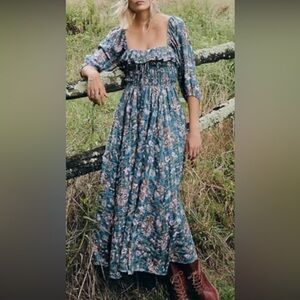 Free People Floral Long Sleeve Dress in Teal and Pink oasis midi