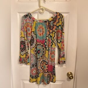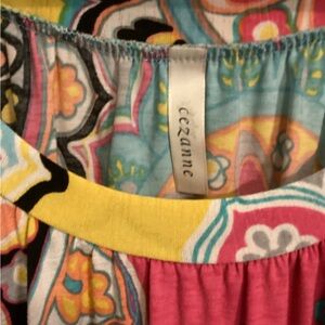 Bright and colorful top with a vibrant pattern. Features a mix of pink, yellow, and blue hues.