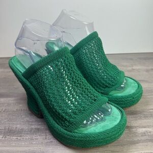 These vibrant green sandals feature a woven texture and a unique sculptural chunky heel, offering a stylish and bold look. The slip-on mule design with an open heel adds a touch of elegance, while the substantial platform sole ensures comfort and stability.