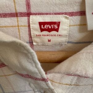 Levi's short sleeve button down shirt with a broad red and blue plaid design over white. A brighter option for plaid!