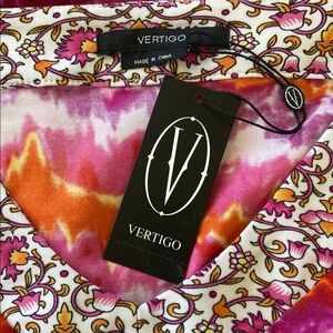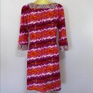 BY VERTIGO PARIS HERE IS A BEAUTIFUL SHEATH STYLE DRESS CALLED “PATINA” DONE IN POLY/SPANDEX SO IT DOES HAVE STRETCH.IT FEATURES A FLORAL TRIMMED V NECK AND FLORAL TRIMMED CUFFS ON THE 3/4 SLEEVES. THE PATINA PATTERN IS DONE IN PINK, VIOLET AND MANGO TYE DYE. ABOVE KNEE LENGTH. NEW WITH T6AGS. SIZE MEDIUM, PLEASE NOTE THE MEASUREMENTS