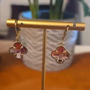 Elegant gold earrings with pink clover design. Perfect for adding sophistication.