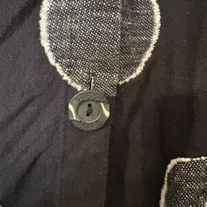 Express your individuality with this stunning Cheyenne Art to Wear oversized linen dress in size S/M. Crafted from breathable linen in an artsy black-and-white dot print, this piece features a button-front design, asymmetric hem, and statement gathered pockets that scream one-of-a-kind style.