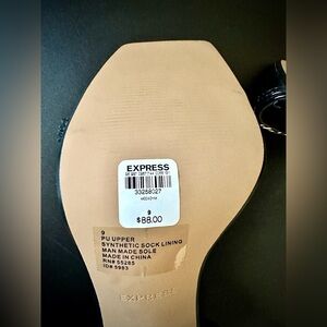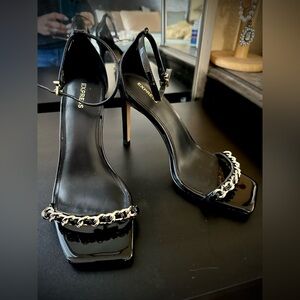 Sleek black heels by Express. Glossy finish with chain accent. Perfect for a night out.