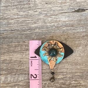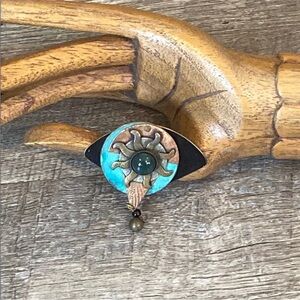 Add a bold artistic touch to your look with this handcrafted vintage brooch featuring a striking sunburst + eye motif. The center green glass cabochon is framed by layered mixed metals and a turquoise patina finish, giving the piece a rustic Southwestern and boho feel. A dangling bead adds movement and charm.