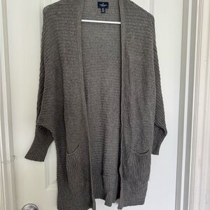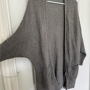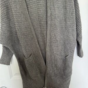 Cozy gray cardigan with open front. Features practical pockets. Ideal for layering.