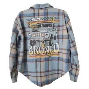 Ford Bronco graphic shacket or flannel shirt jacket. Features a blue and brown plaid pattern with a vintage Ford Bronco graphic on the back along with butterflies and a checkered flag motif. Button front closure with two chest pockets. Perfect for a casual day out or a drive to your favorite scenic spot.