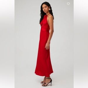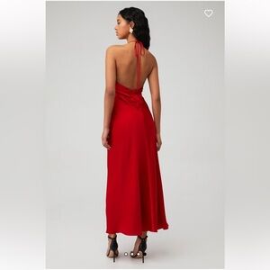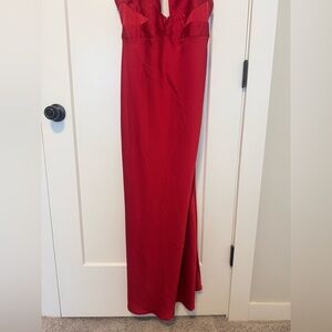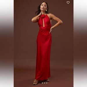 Stunning red halter neck gown with a flowing silhouette. Perfect for formal occasions.