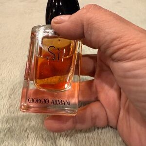 Giorgio Armani perfume with rich amber hue. Elegant design for a luxurious feel. Giorgio Armani Si Eau de Parfum for women, 30 ml (1 oz) bottle. This is a preowned item and does not include the original box. The fragrance has been used; the fill level is shown clearly in the photos for accurate reference. Batch code on base: 38P600. Bottle, cap, and sprayer are all intact and functional. Stored in a cool, dry, smoke-free home. Please review all photos to confirm condition and remaining amount before purchasing. Item will be packaged securely and shipped according to carrier guidelines for fragrances. No returns on cosmetics or fragrances.