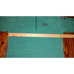 The product is a women's medium green Patagonia sweater, featuring a 1/4 zip design and made of polyester fleece fabric. The sweater has a solid pattern with long sleeves and a pullover style, perfect for outdoor activities. It includes accents like a zipper and the brand logo, making it suitable for all seasons with its comfortable fit and stylish design.