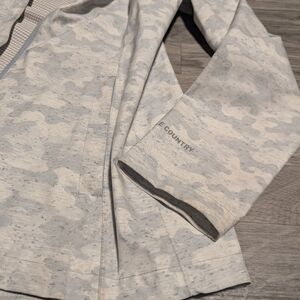 Women's Free Country gray and white camouflage print long sleeve rain jacket. Size medium. Features drawstring hood and functional front pockets. Lightweight, perfect for spring. Has some small stains as noted in picture.