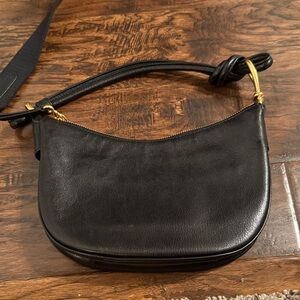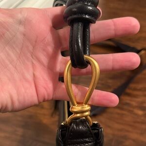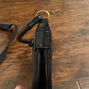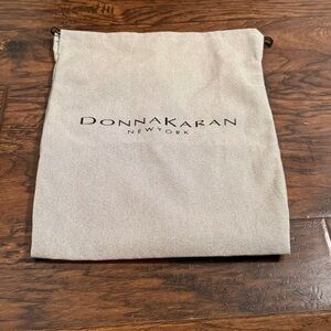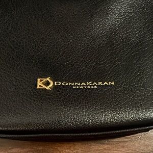 Elegant black leather bag featuring a gold Donna Karan logo. Perfect for any occasion.
