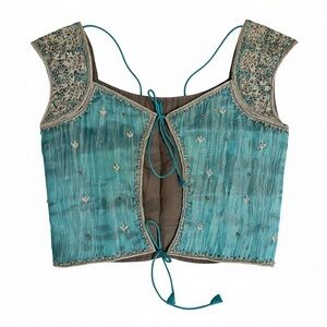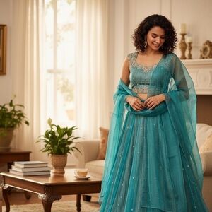 Elegant teal lehenga with intricate detailing. Perfect for festive occasions.