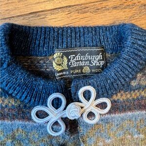 Cozy, authentic, and full of charm — this vintage-style pure wool Fair Isle vest from the Edinburgh Tartan Shop is a stunning piece for cold-weather layering. Beautifully knit with rich tones of navy, moss green, golden ochre, and plum, and finished with a decorative Celtic-style knot toggle closure at the neckline.