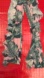 Stylish pants with a tropical leaf print and ruffle details. Features shades of green and pink.