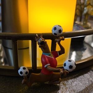 Scooby-Doo ornament juggling soccer balls. Features bright red and rich brown colors. Perfect for fans and collectors. The tail is broke otherwise great condition. Dated 2004 with original box.