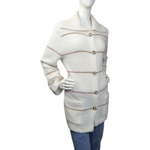Cozy vintage bouclé knit cardigan coat in a soft cream shade with subtle tan stripe accents. Features a wide ribbed shawl-style collar, oversized marbled buttons, front patch pockets, and a long, relaxed silhouette. Warm, textured, and perfect for layering — ideal for cottagecore, fall/winter styling, or a cozy everyday throw-on piece.