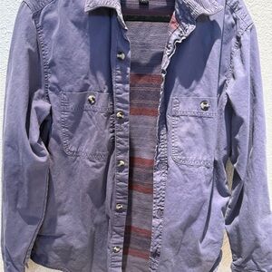 Stylish and lightweight purple shirt jacket by BDG. Features button-up front and dual chest pockets. Ideal for layering.
