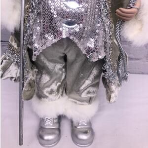 Vintage Christmas Silver White Faux Fur 16" Standing Collectible Santa Ceramic Face Hands Silver Staff