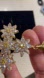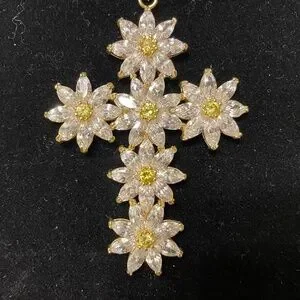 The cross is made up of multiple flower clusters, featuring clear rhinestones petals and yellow stones as the centers.