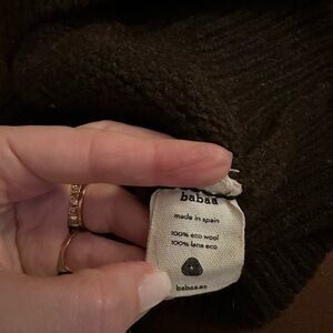 Excellent condition. Worn once and hand washed/dried flat once, but realized I’m allergic to wool. Gorgeous dark brown, untreated Eco Wool.