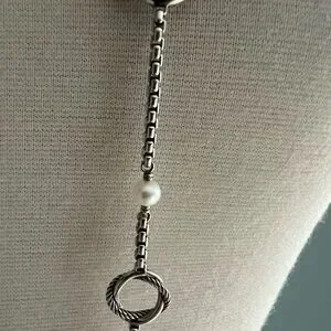 David Yurman Infinity Station necklace in with cultured freshwater pearls and toggle clasp. Necklace is 44 inches in length.The Pearls Measure Approximately 3mm.