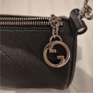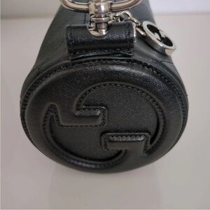 Elegant black leather cylinder bag by Gucci. Features iconic logo and adjustable strap.