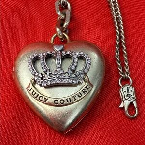 Y2K Juicy Couture heart shaped locket. Locket has a crystal embellished crown with name banner. Opens up and still has original items inside. Locket is 1 1/2 inch wide and 1 1/2 inch long. Has a chain with logo on clasp. I used it as a purse charm. Some wear on back see photo.
