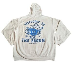 This Soda Sports Welcome To The Bronx New York Yankees Hoodie is a men's size large. It includes a caricature of the old Carvel ice cream baseball cap bowls and is magically nostalgic. Missing pull string, but otherwise very good. Satisfaction guaranteed.
