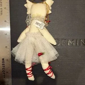 Set of five plush Christmas ornaments including Christmas tree, Santa, reindeer, ballet cat and polar bear. All have strings for hanging.